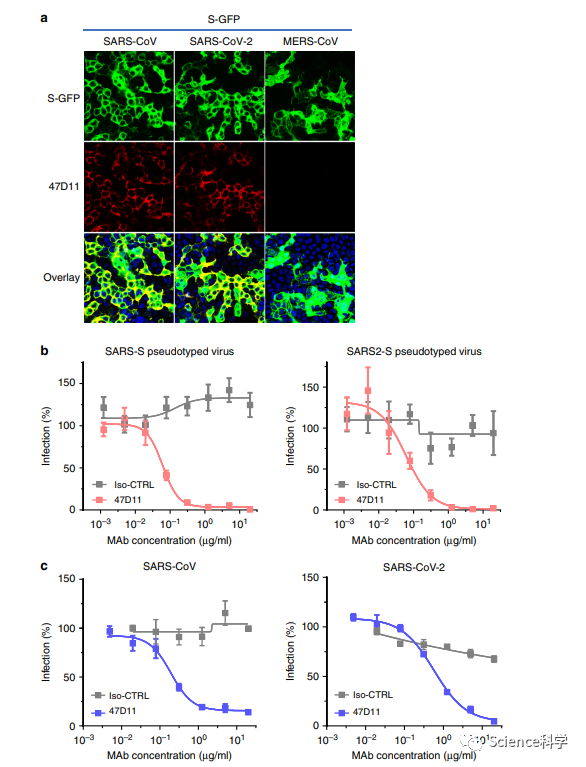 荷兰乌得勒支大学的一个团队开发出了一种名为47D11的单克隆抗体,该抗体在感染了病毒的转基因小鼠中的对应物中被模拟为人类使用。47D11的目标是SARS-CoV-2的刺突糖蛋白(S蛋白),或者说是病毒的关键成分,它能让病毒附着在细胞上的ACE2受体上。如果没有这些蛋白,病毒就无法复制,感染就会被打败。47D11的有趣之处在于,它还可以对抗新型冠状病毒的前体,即SARS。