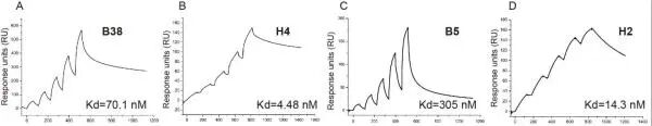 这4种抗体显示出与新冠病毒RBD的不同的结合能力,Kd范围为10的负7次方至10的负9次方M。其中H4表现出相对较高的结合亲和力,Kd为4.48nM,而B5表现出相对较弱的结合亲和力,Kd为305nM。B38和H2与RBD结合,Kd分别为70.1nM和14.3nM。