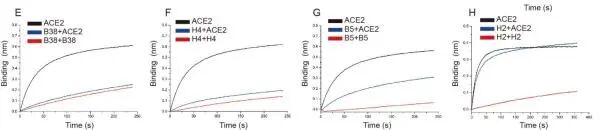 研究团队接下来评估每种抗体阻断病毒RBD与ACE2结合的竞争能力,结果显示,B38和H4能与ACE2完全竞争,并与RBD的结合。相反,B5显示出部分竞争,而H2显示出与RBD结合,但没有与ACE2竞争。