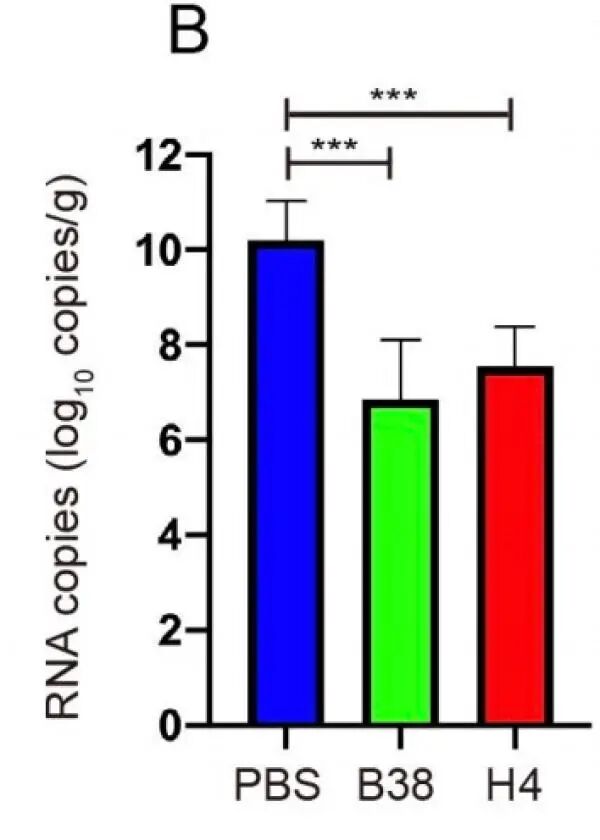 研究团队还检测了3 dpi时小鼠肺组织的病毒RNA拷贝。B38组和H4组的相对RNA拷贝变化均显著低于对照组,与对照组相比分别降低了32.8%和26%。