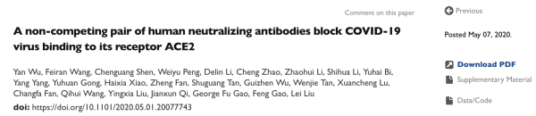 以上研究于当地时间5月7日刊发在生物预印本预印本网站medRxiv上(“A non-competing pair of human neutralizing antibodies block COVID-19 virus binding to its receptor ACE2”《一对非竞争性人类中和抗体可阻断COVID-19病毒与其受体ACE2的结合》)。研究团队从一名中国康复患者中分离出四种人源单克隆抗体,在体外均显示中和能力,其中B38和H4抗体尤其具有潜力。