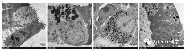 使用透射电子显微镜,研究者在分化的蝙蝠肠样中鉴定出具有四种主要肠道细胞类型特征的细胞,包括肠上皮细胞(E),杯状细胞(G),潘式细胞(P)和肠内分泌细胞(EE),如下图所示: