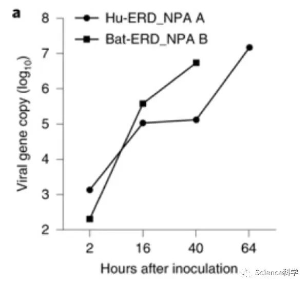 值得注意的是,随着时间的推移,在蝙蝠和人的小肠的培养基中观察到病毒载量大大增加,如下图所示: