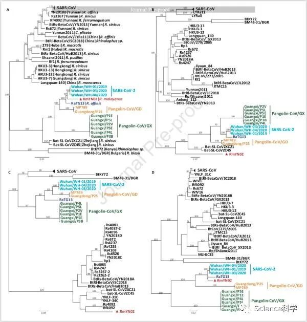 研究团队还对RmYN02、RaTG13、SARS-CoV-2和穿山甲中的蝙蝠冠状病毒进行了系统发育分析。与先前的研究相符,穿山甲beta-CoVs形成两个亚型。然而,论文中提到,穿山甲是否是这些病毒的天然蓄水池,或者它们从蝙蝠或其他野生动物中独立获得,这都需要进一步验证。