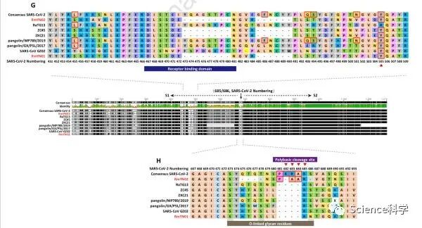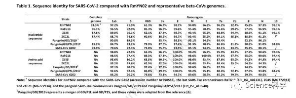 不过,RmYN02和SARS-CoV-2在S基因中的序列一致性(核苷酸71.8%,氨基酸72.9%)远低于RaTG13和SARS-CoV-2之间的97.4%。另外值得注意的是,RmYN02和SARS-CoV-2在RBD中的氨基酸同源性仅为62.4%。而来自广东的穿山甲冠状病毒和SARS-CoV-2在RBD中的氨基酸同源性为97.4%,也是在RBD区域目前和SARS-CoV-2最接近的。