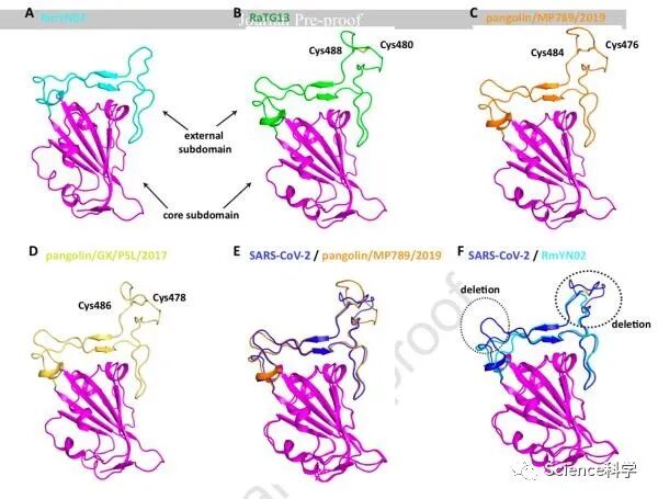 研究发现,RmYN02 RBD中的氨基酸缺失在受体结合位点附近形成了两个比SARS-CoV-2 RBD短的环。重要的是,在SARS-CoV、SARS-CoV-2、RaTG13、穿山甲/MP789/2019、穿山甲/GX/P5L/2017的外子域(external subdomain )保守的二硫键在RmYN02中缺失了。研究团队推测,这些缺失可能导致构象变化,从而减少RmYN02 RBD与ACE2的结合,甚至导致不结合。