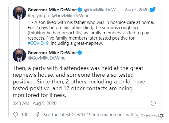 DeWine在Twitter上分享了COVID-19社区传播的其他例子。