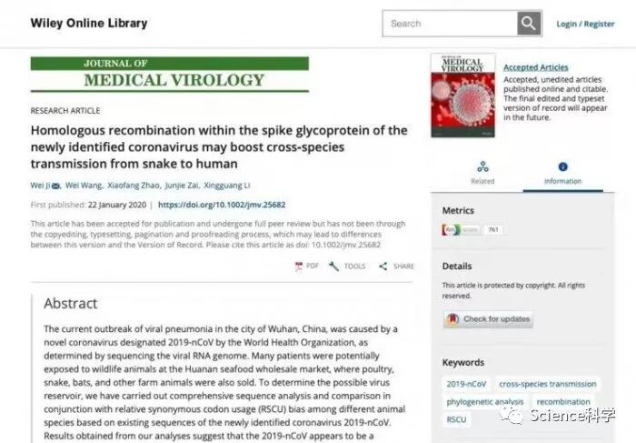1月22日,一篇发表在Journal of Medical Virology(医学病毒杂志)的论文指出,与刺猬、穿山甲等其他动物相比,2019-nCoV的密码子使用偏好与蛇类似,因此蛇最有可能是携带新型冠状病毒的动物。