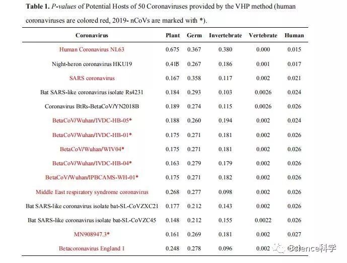 文中提到,随着全基因组序列的在线发布,他们预测了新型冠状病毒2019-nCoV的潜在宿主。结果显示,2019-nCoV的6个基因组均具有较高(p值<0.05)感染人类的可能性。