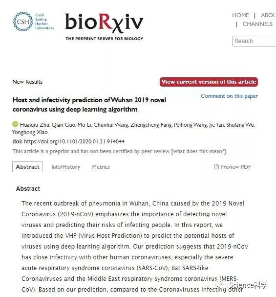 1月24日,北京大学工学院教授朱怀球团队在bioRxiv预印版平台发表题为《深度学习算法预测新型冠状病毒的宿主和感染性》的文章。基于深度学习算法开发的VHP(病毒宿主预测)方法,推测出蝙蝠和水貂可能是新型冠状病毒的两个潜在宿主,水貂可能为病毒传播的中间宿主。