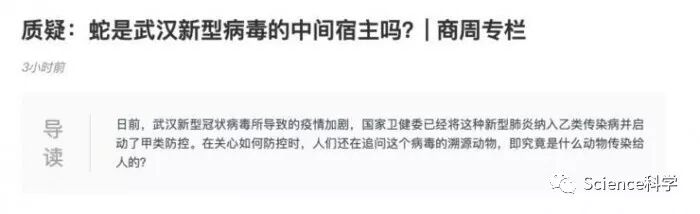 不过,这样的消息很快得到了学界的质疑:科学媒体“知识分子”商周专栏在23日发表文章称,“此前流行的SARS和MERS病毒的自然宿主均是蝙蝠,通过果子狸和骆驼传染给人,也就是说,病毒的传递是在哺乳动物之间进行的。但蛇不是哺乳动物,而是爬行类。”