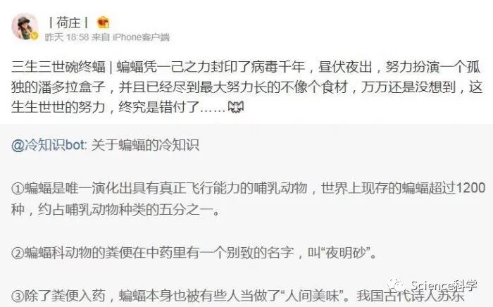 微博网友@|荷庄|表示:蝙蝠凭一己之力,封印了病毒千年,昼伏夜出,努力扮演一个孤独的潘多拉盒子,并且已经尽到最大努力长得不像个食材,万万还是没想到,这生生世世的努力,终究是错付了……