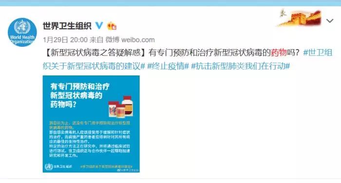 世界卫生组织1月29日曾发微博表示:到目前为止,还没有专门用于预防和治疗新型冠状病毒的药物。