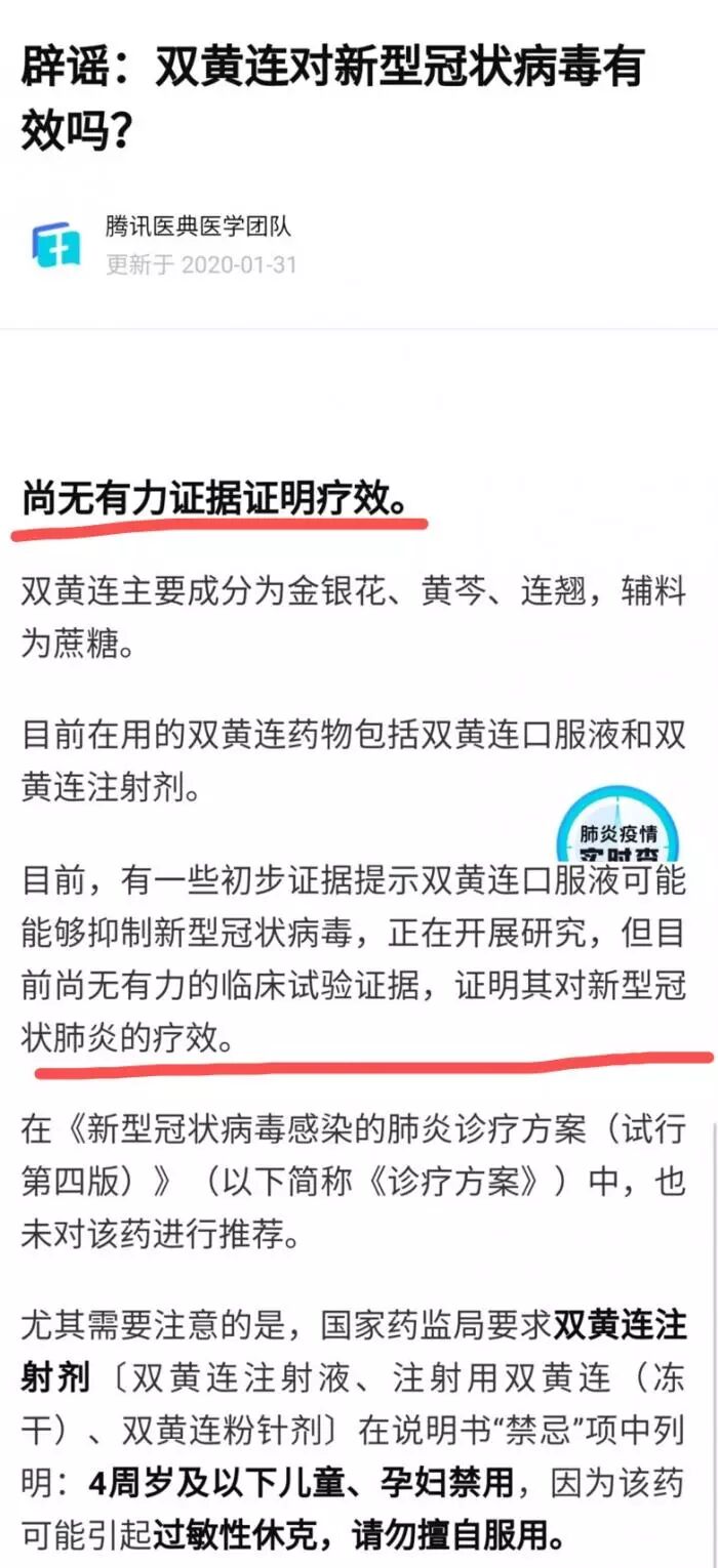 31日深夜,腾讯医典发布标题为《辟谣:双黄连对新型冠状病毒有效吗?》的文章称,尚无有力证据证明疗效。双黄连主要成分为金银花、黄芩、连翘,辅料为蔗糖。目前在用的双黄连药物包括双黄连口服液和双黄连注射剂。