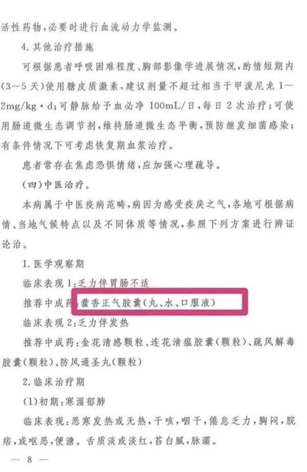 此前,1月22日在国家卫健委与国家中医药管理局联合发布的《新型冠状病毒感染的肺炎诊疗方案(试行第四版)》中,藿香正气口服液、金花清感颗粒、连花清瘟胶囊等制剂也被列为医学观察期推荐用药。