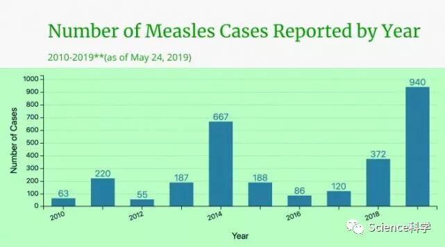 在2019年,美国有940人报告了(并且已经CDC确认)麻疹病例。这些病例发生在26个州。2016年确诊病例数为86例。自那以后,每年在美国确诊的麻疹病例数量大幅增加。