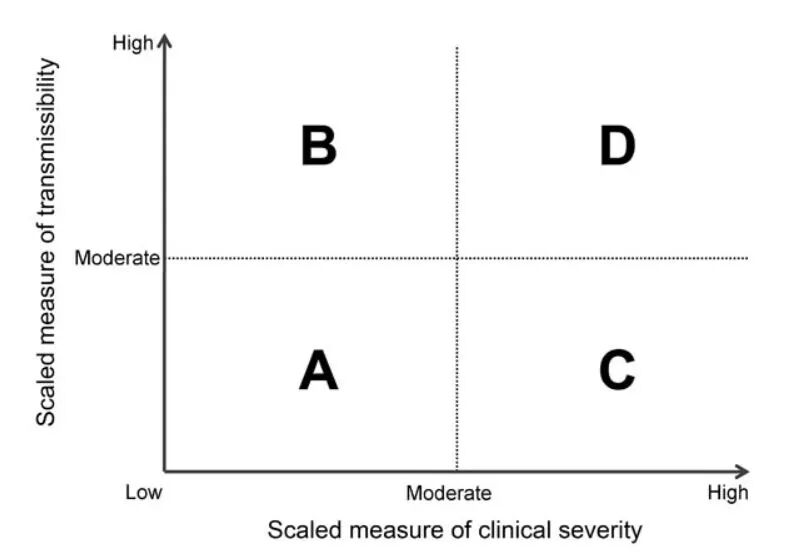 这两个关键要素(感染的传播速度和致命程度)A象限-传染性不太强,可能不是很容易传播并且通常不会导致严重疾病的病毒。在另一个极端,1918-1919年的流感大流行处于D区-传染性和严重性。Emerging Infectious Diseases.2013;19(1):85-91.