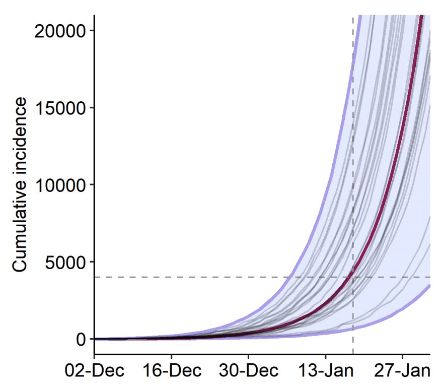 伦敦帝国理工学院的MRC全球传染病分析中心曾经两度发布报告称估计到武汉封城开始前一周,到1月18日,武汉至少有4,000人被感染。他们的模型表明,加上仍处于潜伏期、未发病的个案,预料武汉已有4.4万人感染,而病毒的基本繁殖率为2.6,相当于疫情每6.2日就会倍增。