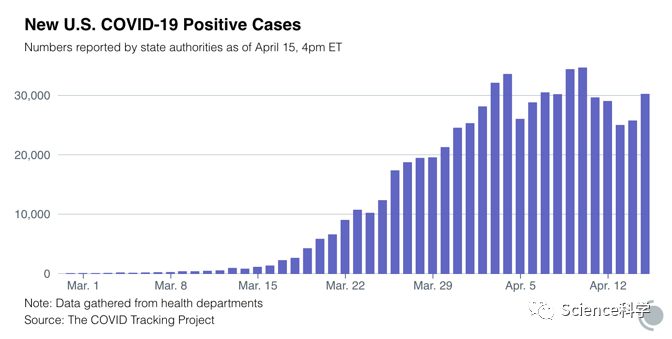 较高的阳性率表明,美国的新病例数量之所以趋于稳定,只是因为美国的检测能力已经达到了上限。仅从阳性病例来看,虽然美国确诊病例数量正朝着65万例(截至4月15日数据)迈进,但每天新增病例的数量似乎在趋于稳定,甚至在下降。