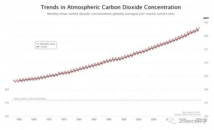 尽管人类已经日益重视二氧化碳排放和气候变化问题,不过根据最新记录数据来看二氧化碳含量依然呈现持续上升趋势。科学家自1958年以来,在夏威夷毛纳罗阿天文台监测大气中二氧化碳的浓度,并绘制了一条稳步加速上升的曲线。