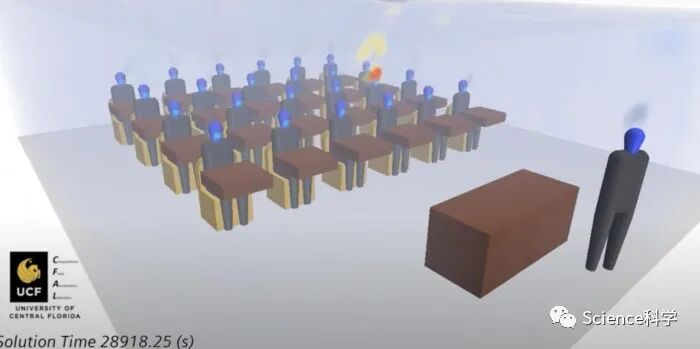 教室模型为709平方英尺,有9英尺高的天花板。模型中有戴口罩的学生和一位同样也戴了口罩的老师,后者站在教室前面。