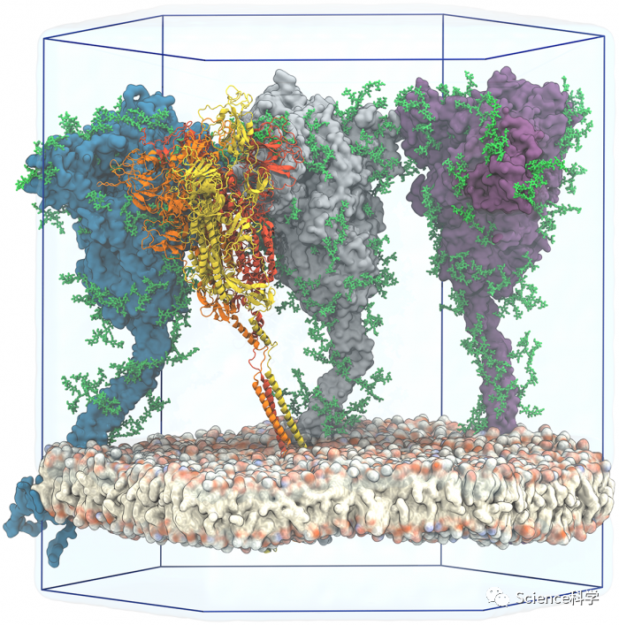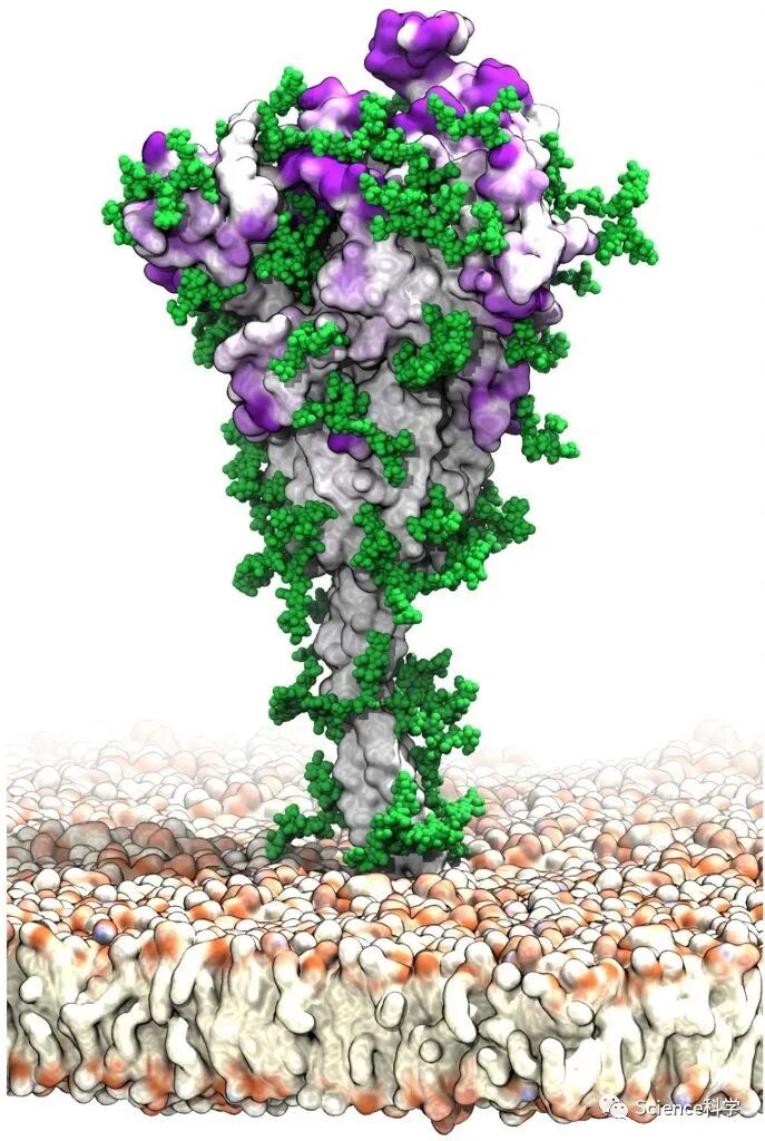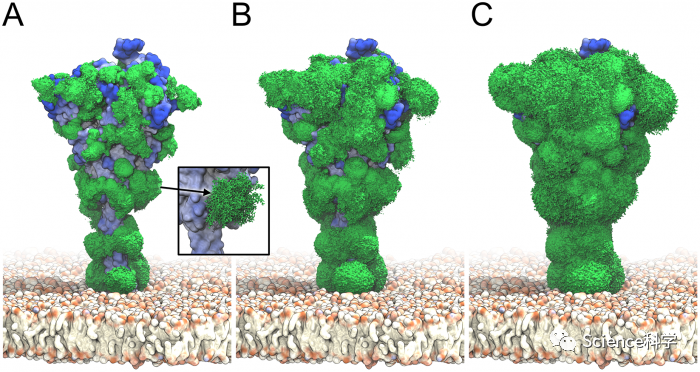 这些模拟表明,刺突糖蛋白上的聚糖起到了动态屏蔽的作用,帮助病毒逃避人类免疫系统。类似于汽车挡风玻璃雨刷,聚糖通过来回翻动几乎覆盖了整个刺突糖蛋白表面,尽管在任何特定的瞬间它们的覆盖面都是最小的。