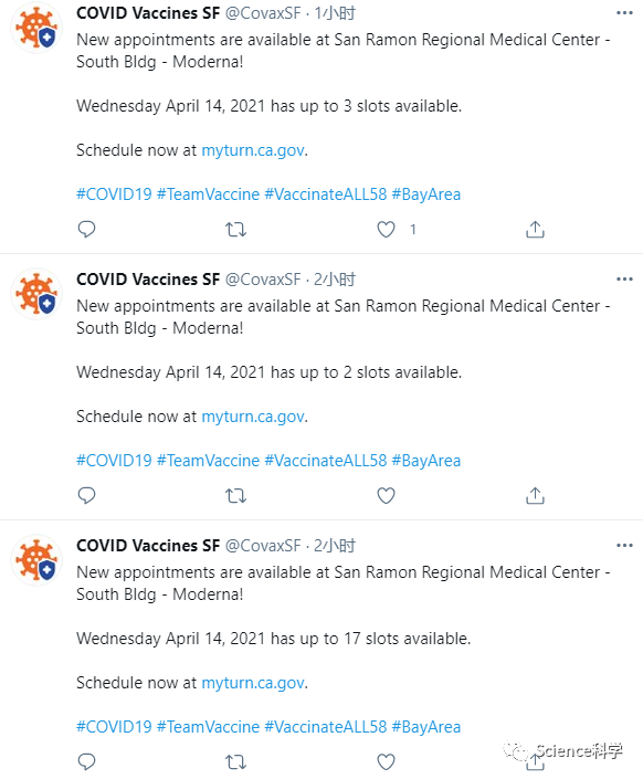 上周推出的CovaxSF机器人覆盖了旧金山、圣克拉拉、康特拉科斯塔和阿拉米达县的大部分地区,通常每天会发20到30次推文。4月1日,50岁及以上的加州人加入了州政府的资格名单,该名单中已经包括了老年人和那些高风险、高接触几率的人。4月15日,每个16岁及以上的加州人都可以接种疫苗,这将大大增加本已激烈的可用名额竞争。