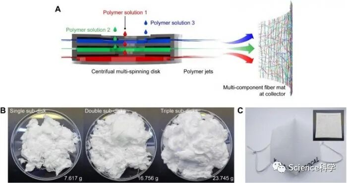 论文主要作者博士生Byeong Eun Kwak和他的研究人员Hyo Jeong Yoo和Eungjun Lee利用这种带有三个子盘的新型离心式多纺丝喷丝板,演示了各种聚合物纳米纤维的克级生产,最高生产速度可达25克/小时,比传统的电纺系统高出约300倍。每小时高达25克聚合物纳米纤维的生产速度相当于实验室规模生产系统每天生产约30个口罩滤网的速度。
