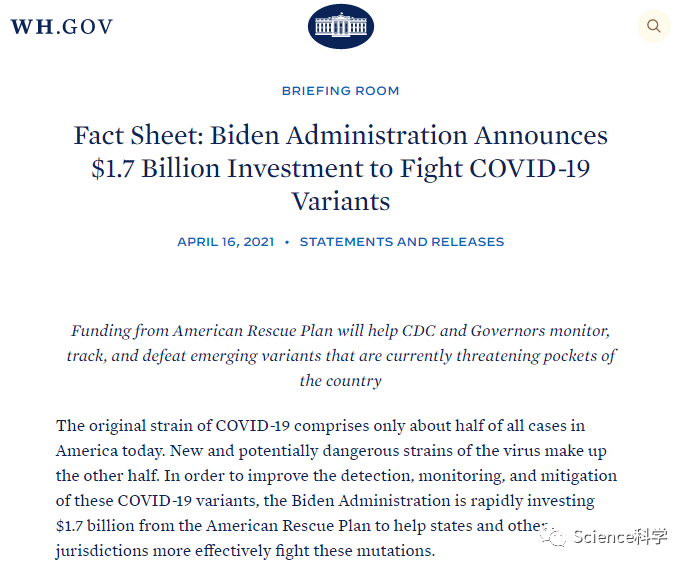 随着新冠变异毒株在美国境内大肆传播,拜登政府也推出了一些应对措施,比如向州政府提供 17 亿美元的援助。主管部门解释称,这笔资金将用于改善 SARS-CoV-2 的突变检测、监测和缓解工作,且美国疾控中心(CDC)将负责具体的拨付分配。