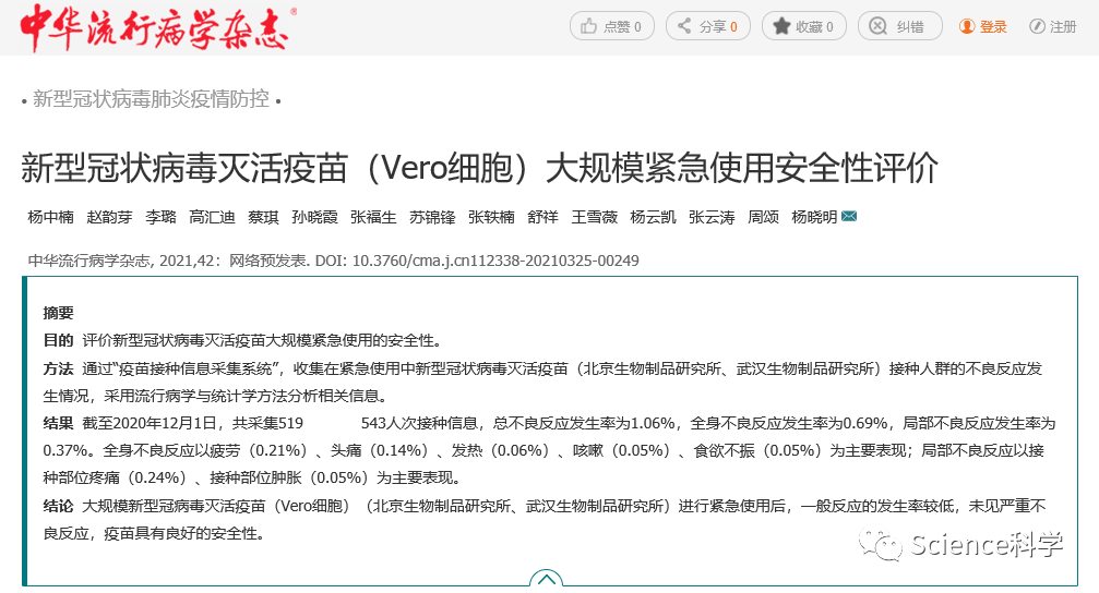4月21日,中国核心学术期刊《中华流行病学杂志》刊登了题为“新型冠状病毒灭活疫苗(Vero细胞)大规模紧急使用安全性评价”的论文,公布了基于国药集团中国生物北京制品研究所、武汉生物制品研究所的新冠灭活疫苗大规模紧急使用的安全性评价,其中就包含详尽的不良反应数据。