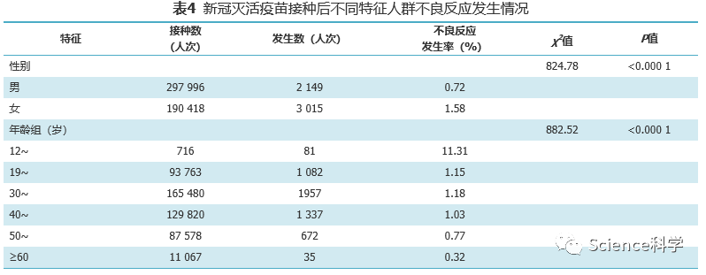 按年龄划分,不良反应发生率最低为≥60岁人群,不良反应发生率为0.32%,其次是30-39岁人群,不良反应发生率为1.18%,12-18周岁人群不良反应发生率最高,为11.31%,以疲劳及接种部位疼痛为主。
