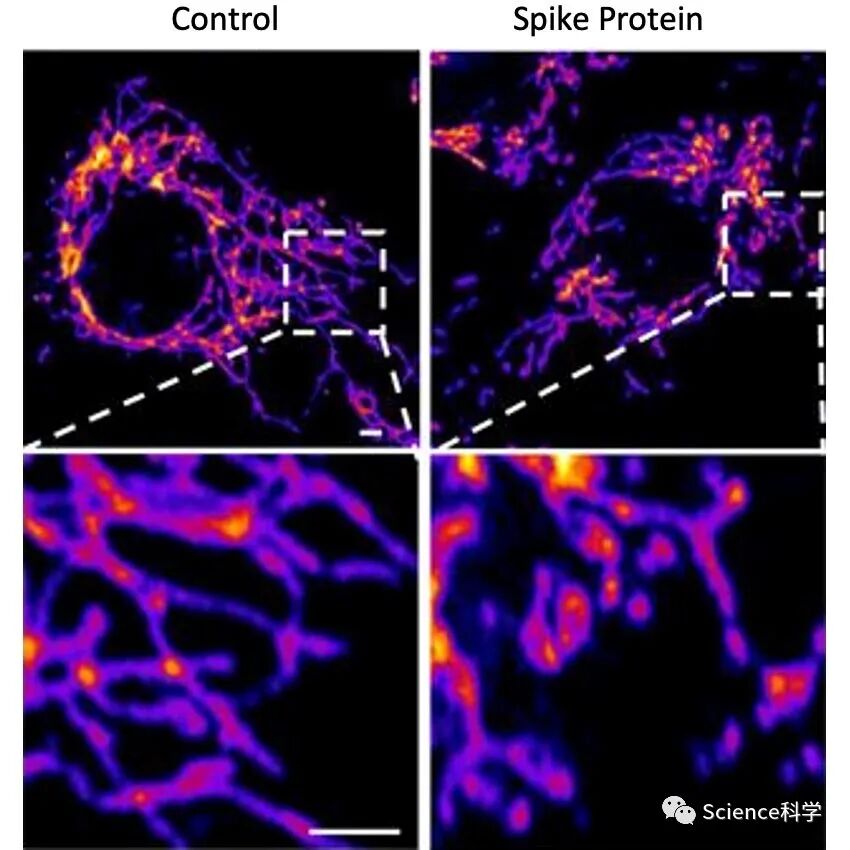 然后研究小组在实验室复制了这一过程,他们将健康的内皮细胞暴露在刺突蛋白下。结果他们发现刺突蛋白通过跟ACE2结合来破坏细胞。这种结合破坏了ACE2向线粒体发出的分子信号,进而导致线粒体受损和破碎。