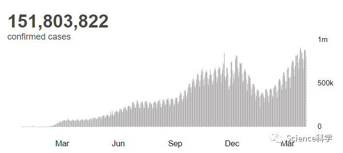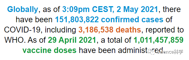 根据世卫组织最新实时统计数据,截至欧洲中部夏令时间5月2日15时09分(北京时间5月2日21时09分),全球累计新冠肺炎确诊病例151803822例,累计死亡病例3186538例。5月2日全球新冠肺炎确诊病例新增808563例,死亡病例新增12870例。