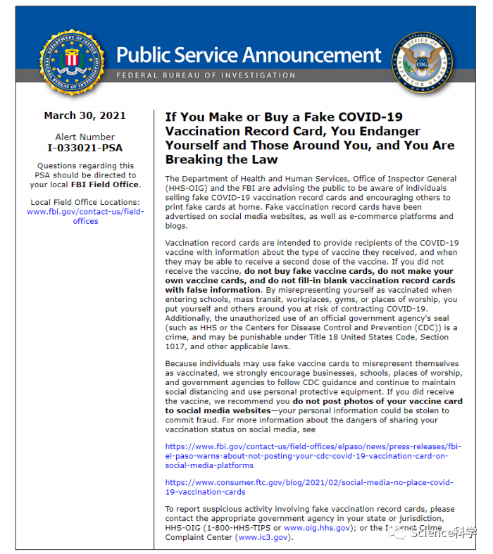 FBI继续警告企业、学校、宗教场所和政府机构继续遵循美国疾病控制与预防中心 (CDC) 的指导,保持社交距离,并使用个人防护设备,"因为个人可能使用假的疫苗接种卡来虚报自己已接种疫苗"。换句话说。使用这些假疫苗接种卡的人正在使这种活跃的大流行病和他们试图回避的安全规则必须延长。
