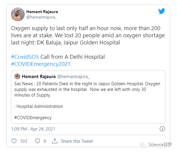 印度的医生、医院负责人、记者和其他Twitter用户出于绝望,一直在发推文并在其他社交平台上发出增加氧气供应的呼吁,因为印度的新冠肺炎新增病例和死亡人数创下了新高。印度的氧气供应处于严重的低水平,一些医院已经不堪重负。