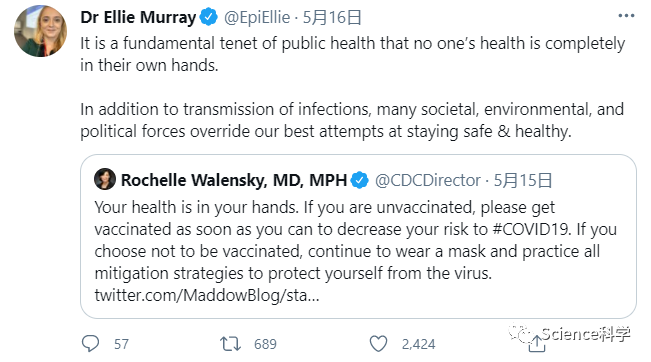 “我可能会说人们要对自己的健康负责,” Walensky告诉PBS NewsHour。“如果你没有接种疫苗,这又是把你对自己健康的责任揽在自己身上。”她在Twitter上发布了类似的言论,称“你的健康掌握在你自己手中”。