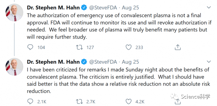 Hahn向《金融时报》解释了他做出这一决定的原因。几天前,Hahn因支持血浆疗法而受到了大量批评。