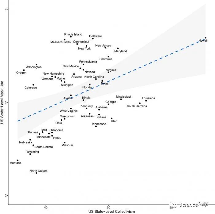 通过分析这两个数据集,研究人员考察了戴口罩与美国50个州的集体主义措施之间的关联程度。美国各州的集体主义可以根据人口中具有代表性的样本对调查的答复来进行分级。