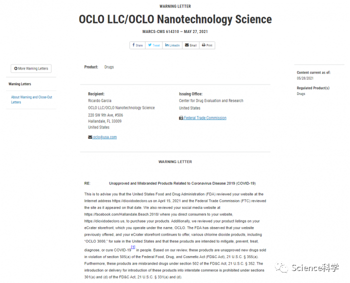FDA称该公司一直在提供的产品包括OCLO 3000(Gotero)-免疫增强剂和抗病毒剂,这是一种含有3000ppm二氧化氯的水溶液。FDA的信函称,OCLO在销售这种产品时声称,除其他外,它 “可用于对抗大量的病毒感染,包括COVID-19”。