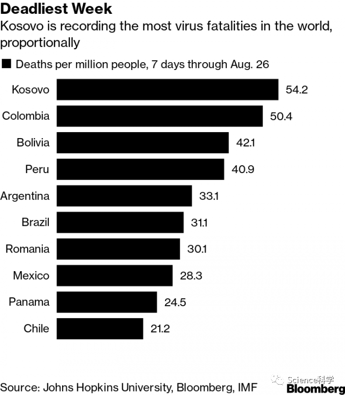 虽然美国已经出现了近19万例与新冠病毒相关的死亡病例,但目前新冠死亡率最高的地区是科索沃自治省。在8月的最后一周,科索沃每100万人中就有54.2人因感染新冠病毒死亡。其他新冠病毒死亡率较高的国家包括哥伦比亚、玻利维亚和秘鲁。