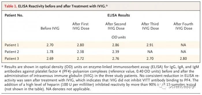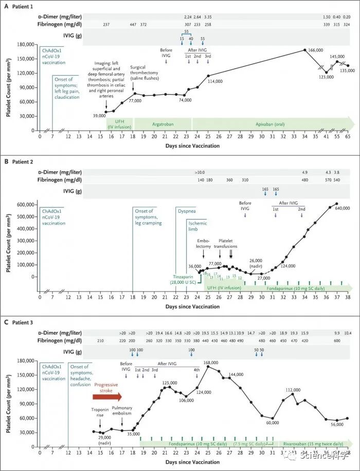 研究配图 - 1:三名 VITT 患者的临床与实验室数据