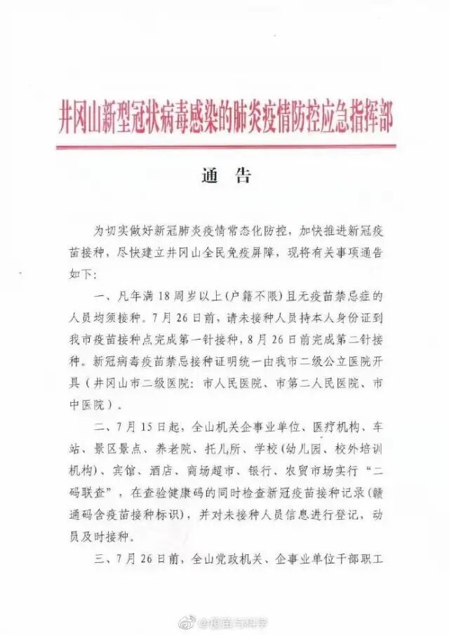 江西赣州安远县发布通告,7月26日起,原则上不允许未接种新冠病毒疫苗人员进入超市、医院、学校、车站等重点公共场所(有禁忌接种证明和18周岁以下人员除外)。