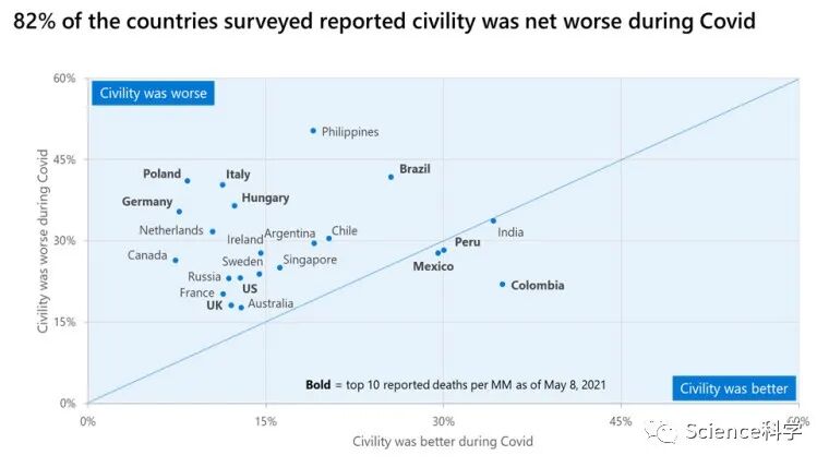 调查结果显示,82%的国家在疫情期间经历了网络文明的恶化现象。在22个接受调查的国家中,只有4个国家出现了净正面效益变化,它们是哥伦比亚、秘鲁、墨西哥和印度。与此同时,德国、意大利、波兰、菲律宾和匈牙利等国的纯负性最为严重,如下图所示:
