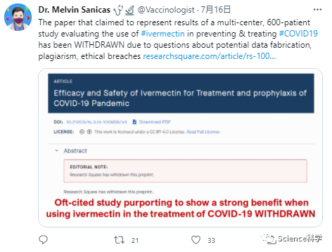 "如果你从科学文献中删除这一项研究,突然间,伊维菌素治疗COVID-19的正面随机对照试验就很少了。事实上,如果你只去掉这项研究,大多数发现积极结果的荟萃分析的结论将完全被推翻"。