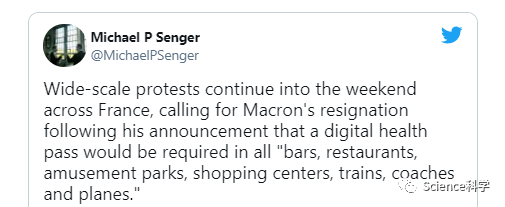 法国已经经历了三次全国性的封锁,法国总统马克龙希望避免第四次封锁。上周,他为此推出了一个“健康通行证”制度,公民很快就会被要求接种COVID-19疫苗,以便经常出入咖啡馆、餐馆、购物中心等。这一宣布导致了疫苗接种率的上升--但也导致了上周末法国各地的大规模抗议活动。