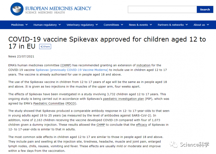欧盟监管机构说,一项涉及3700多名青少年的研究显示,这种疫苗产生的抗体反应与成人的抗体反应相当。在Moderna公司宣布该疫苗在青少年中的疗效后近两个月,该机构才批准。