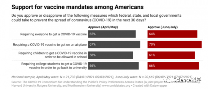 项目研究人员之一、西北大学政治学家James Druckman说:“对强制性疫苗接种的支持率比许多人意识到的要高,而且还在增加,这可能是由于德尔塔变体的传播和对今年秋天开学的焦虑。”