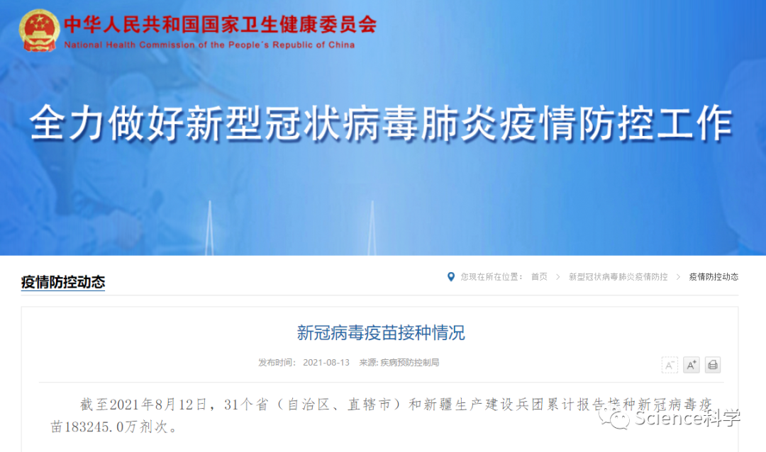 在国务院联防联控机制举办的新闻发布会上,国家卫生健康委新闻发言人米锋介绍,截至8月12日,全国累计报告接种新冠病毒疫苗183245万剂次,完成全程接种的人数为77704.6万人。