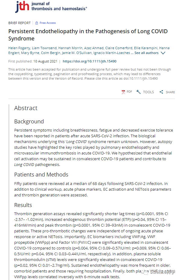 研究人员观察到,较高的凝血指标与Long COVID综合征的其他症状直接相关,如身体素质下降和疲劳。即使炎症的标志物都已恢复到正常水平,但这种凝血潜力的增加仍然存在于Long COVID患者身上。
