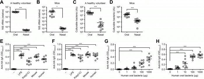 研究人员还发现,虽然上呼吸道含有共生细菌,但鼻粘膜表面的可培养共生细菌的相对数量明显低于口腔。研究人员测试了鼻内补充培养的口腔细菌是否会增强对鼻内注射疫苗的抗体反应,并发现口腔细菌与鼻内疫苗相结合会增加对鼻内注射疫苗的抗体反应。